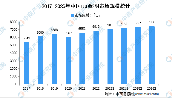 隨著中國LED照明滲透率進一步提升,中國LED照明市場規模保持較大幅度增長,按下游應用環節產值計算,由2017年的5343億元上升到2021年的6552億元,年均復合增長率為5.2%。隨著行業發展漸趨穩定,預計LED照明市場規模將由2022年的6813億元增長到2026年的7386億元,年均復合增長率將達到2.0%。