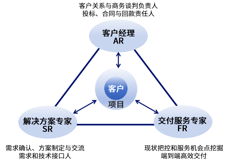 成立面向客戶的客戶關系、產品和解決方案、交付為核心的鐵三角組織