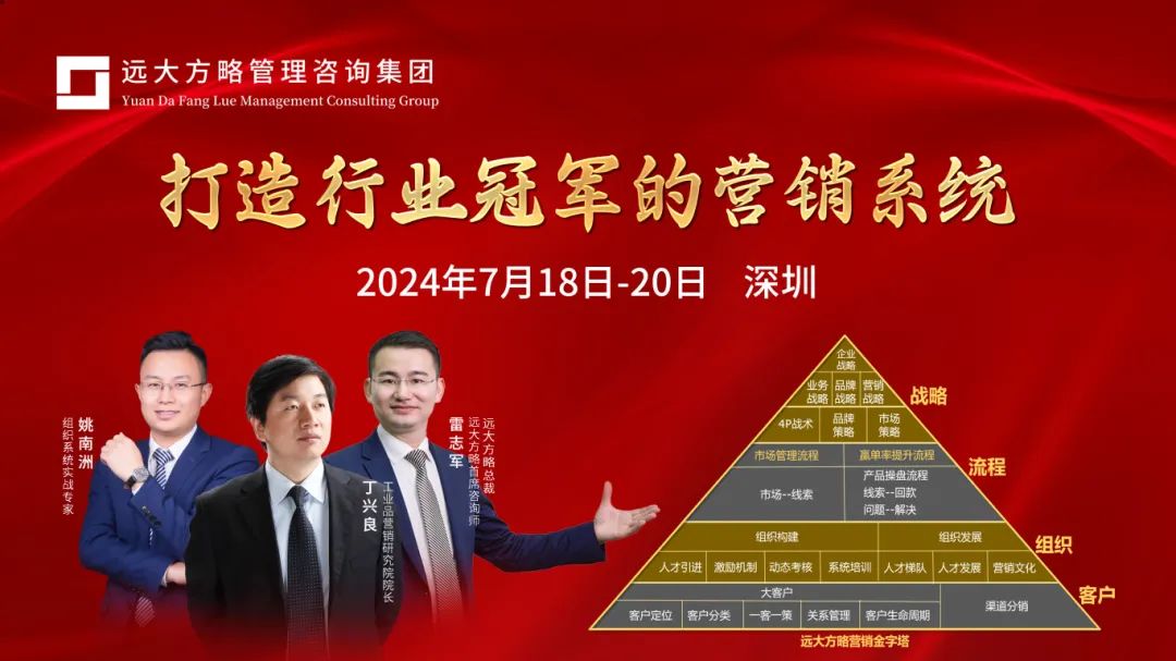 7月18日-20日,遠大方略《打造行業冠軍的營銷系統》,三大實戰導師聯袂授課,深度剖析成功咨詢實戰案例,學會一套營銷系統打造的系統方法,實現可持續增長。