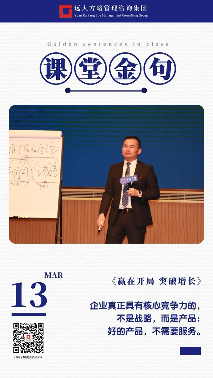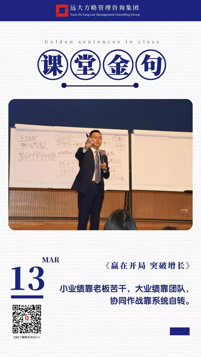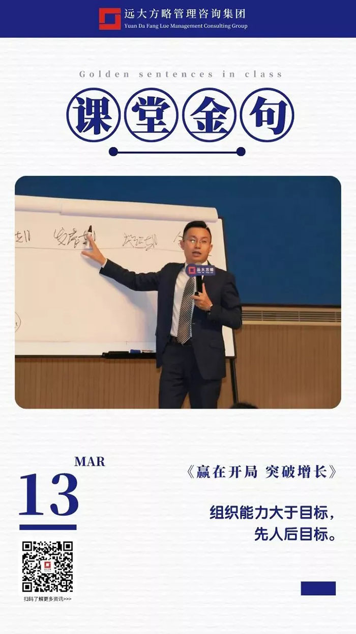 課上老師采用“道、法、術、器”相結合的形式給學員們帶來了一場精彩的知識盛宴。3月13日的課堂上兩位老師也總結了很多金句,可以很好的運用到企業的經營管理中。為了幫助大家更好的吸收和鞏固兩天的學習,小編整理了今天課程雷老師的部分金句分享給大家,希望能給大家帶來更多啟發。