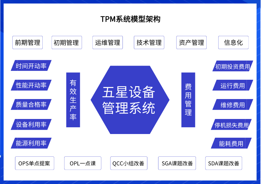 遠(yuǎn)大咨詢在近十年的TPM咨詢服務(wù)活動中,總結(jié)實戰(zhàn)經(jīng)驗不斷研究,推出了圍繞《設(shè)備管理系統(tǒng)》為中心的TPM推進模型。此模型追求2個目標(biāo)、5種改善形式、6項運營模塊,具體來說