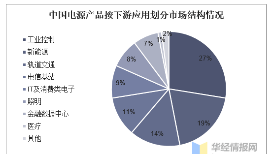 電源產(chǎn)品下游應(yīng)用領(lǐng)域廣泛,據(jù)統(tǒng)計,工業(yè)控制和新能源行業(yè)市場規(guī)模占比最高,分別為27%、19%,其他依次為軌道交通、電信基站、IT及消費電子,分別占比14%、11%、9%。