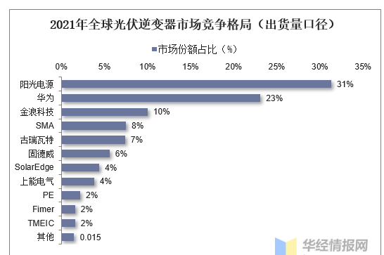 就光伏逆變器市場競爭格局而言,2021年全球逆變器出貨量排名前10的廠商中,中國企業(yè)占了6家,分別是華為、陽光電源、古瑞瓦特、錦浪科技、上能電氣和固德威。其中,陽光電源以31.3%的市占率排名第一,行業(yè)集中度進一步提升,占比市場份額持續(xù)提升。