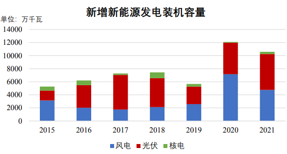 其中光伏發(fā)電和風(fēng)力發(fā)電增長迅猛。2021 年度全國新能源裝機(jī)容量超過 10,000 萬千瓦,占全部電力新增裝機(jī)的 60%。近年全國新增新能源發(fā)電裝機(jī)容量情況如下圖所示: