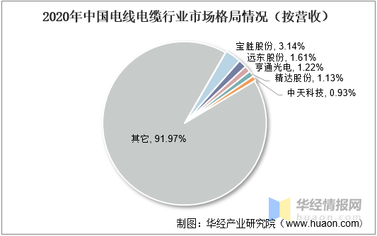 目前,我國電線電纜行業市場集中度較低,行業CR5僅為8.03%。具體來看,2020年我國電線電纜市場中,寶勝股份以3.14%的市場份額占據第一,其次為遠東股份和亨通光電,市場份額分別為1.61%和1.22%。