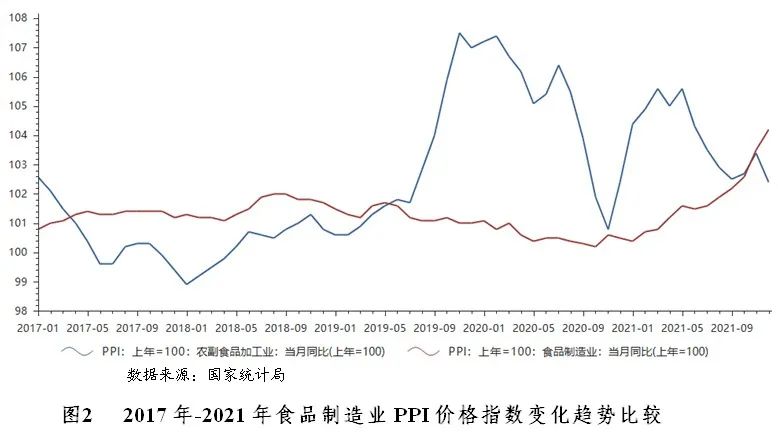 由于成本端原材料、包材、運費齊漲,產(chǎn)業(yè)鏈利潤被擠壓,2021年食品制造業(yè)出廠價格呈現(xiàn)上漲趨勢。國家統(tǒng)計局數(shù)據(jù)顯示,2021年食品制造業(yè)工業(yè)生產(chǎn)者出廠價格指數(shù)為104.20,農(nóng)副食品制造業(yè)工業(yè)生產(chǎn)者出廠價格指數(shù)為102.4,表明食品價格較2020年同期略有增長。在“疫情”之下,食品作為剛需產(chǎn)品,需求下降不明顯,價格并未受到較大影響。