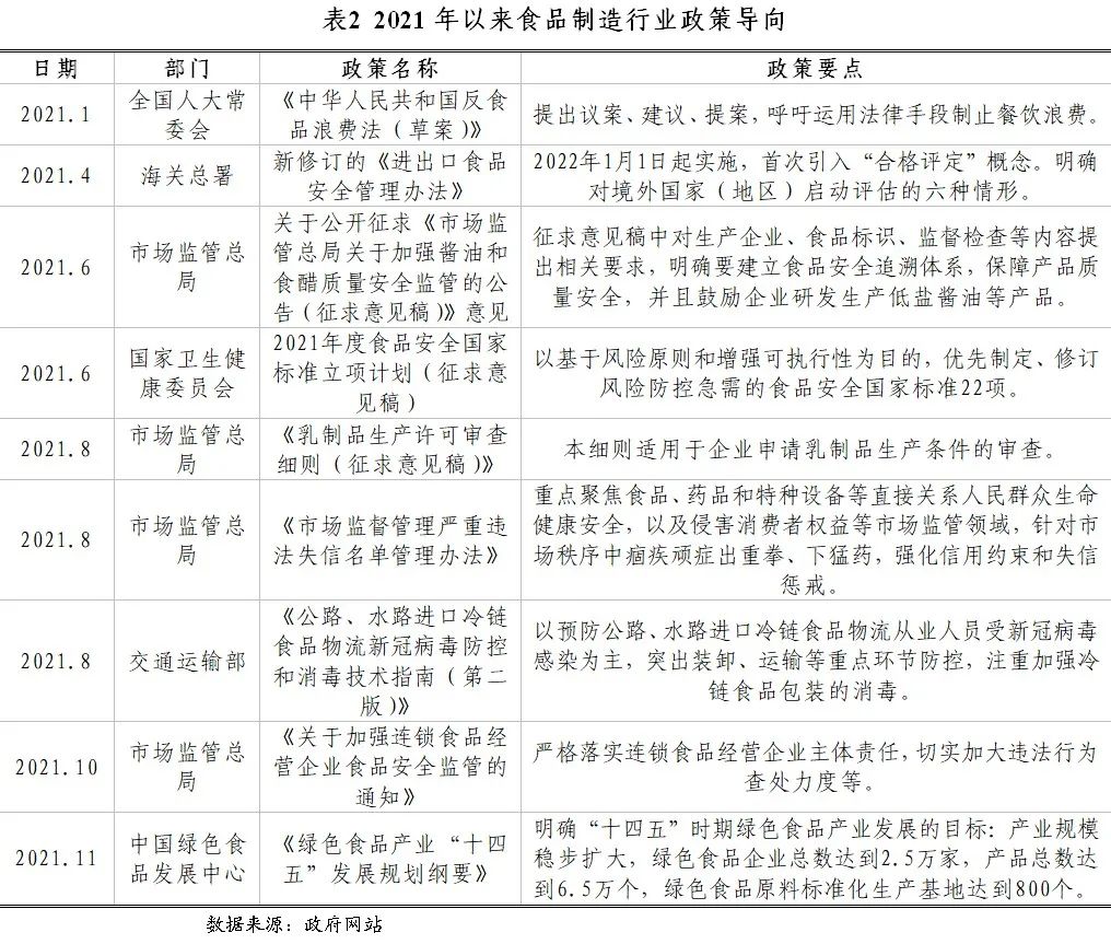 2021年,我國宏觀政策效應持續(xù)顯現(xiàn)為食品制造行業(yè)帶來積極作用,行業(yè)監(jiān)管政策主要圍繞加強食品安全監(jiān)管和推動產(chǎn)業(yè)健康有序地向高質量發(fā)展。