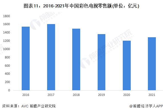 從彩電的零售額看,2016-2021年呈現波動下降趨勢,2017年達到最高值為1609億元,2018年以來一路下降,2021年彩電零售額為1289億元,較2020年增長6.6%。