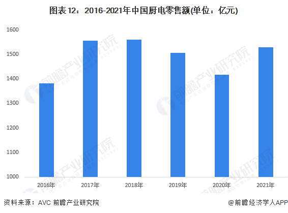 2016-2021年中國廚電零售額波動變化,其中2018年達到最近4年最高值為1559億元,2019年起有所下降,2021年達到1528億元,較2020年增長約7.9%。