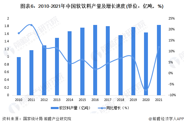 國家統(tǒng)計局?jǐn)?shù)據(jù)顯示,2010-2021年,我國軟飲料產(chǎn)品產(chǎn)量呈現(xiàn)增長趨勢,但增長速度總體波動下降。2017-2018年,我國軟飲料產(chǎn)量下滑,到2019年有所恢復(fù),2019年我國軟飲料產(chǎn)量為1.78億噸,同比增長13.29%;2020年受疫情影響,軟飲料產(chǎn)量為1.63億噸;2021年我國軟飲料產(chǎn)量回升至1.83億噸,同比增長12%,回到與2016年相同的近十年高點水平。
