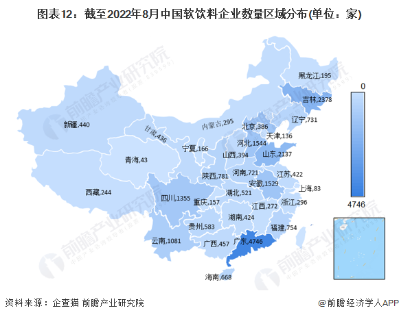 根據(jù)中國企業(yè)數(shù)據(jù)庫企查貓,截至2022年8月下旬,中國軟飲料企業(yè)主要分布在廣東省。截至2022年8月下旬,廣東共有相關(guān)軟飲料企業(yè)數(shù)4746家,吉林有2378家,山東有2137家。