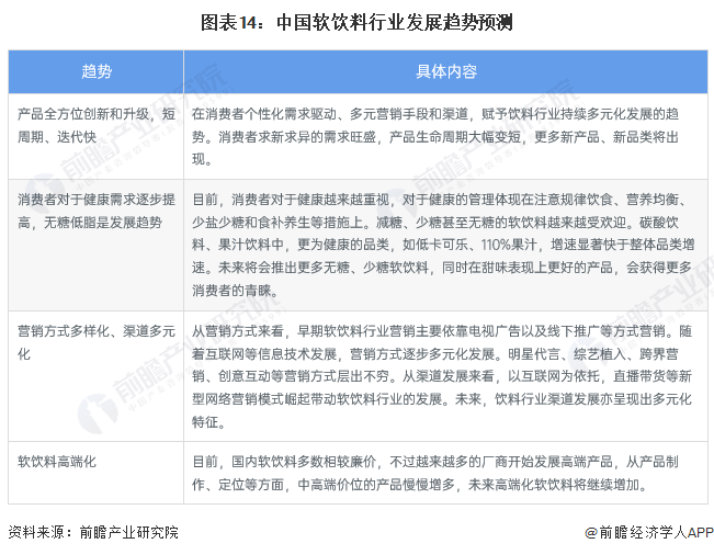 中國軟飲料行業(yè)在消費者個性化需求驅(qū)動、營銷手段和渠道多元化發(fā)展的大背景下,軟飲料產(chǎn)品生命周期大幅變短,更多新產(chǎn)品、新品類將出現(xiàn);隨著消費者對于健康越來越重視,減糖、少糖甚至無糖的軟飲料越來越受歡迎。另外,從營銷方式上來看,綜藝植入、跨界營銷、創(chuàng)意互動等營銷方式和直播帶貨等新型網(wǎng)絡(luò)營銷模式將成為越來越多企業(yè)和品牌的選擇。