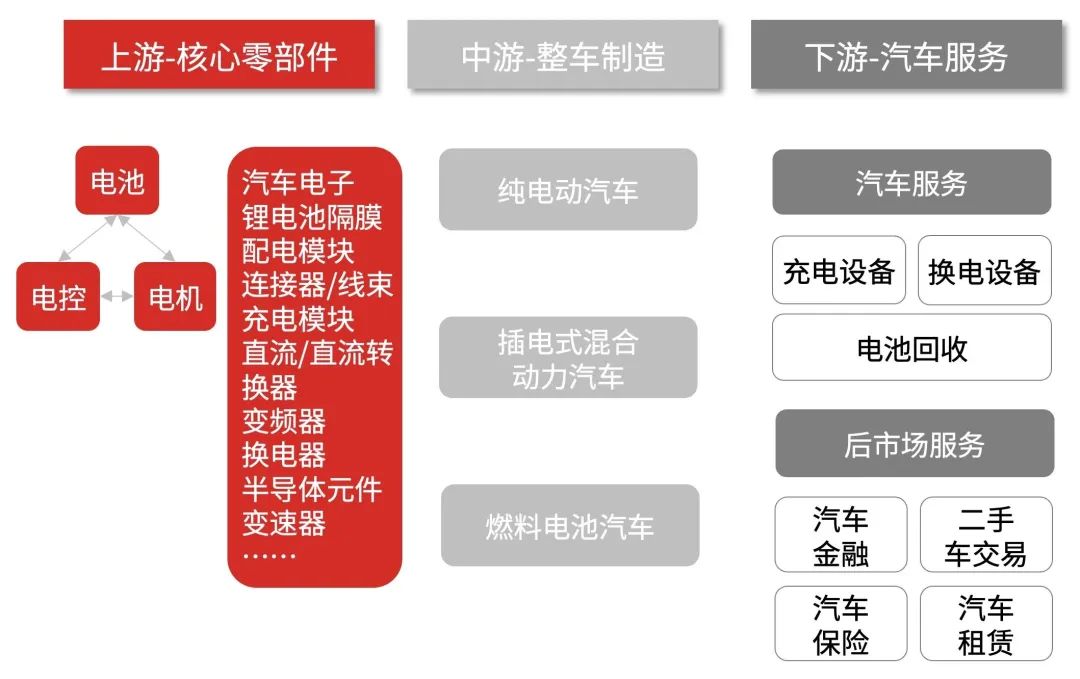 新能源汽車行業(yè)的產(chǎn)業(yè)鏈主要由核心零部件(上游)、整車制造(中游)、汽車服務(wù)(下游)組成。