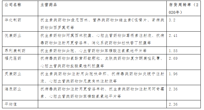 醫藥制造行業的存貨普遍較大,經對比研究上市公司2020年公開數據,得出結論醫藥制造行業平均存貨周轉率在2-3之間(按產品細分領域不同可能存在一定差異)。