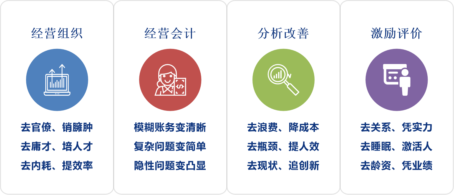 4、數(shù)據(jù)增長:(1) 公司高層、中層、基本價值觀高度統(tǒng)一;(2)公司企業(yè)文化清晰明確,提倡什么、禁止什么清楚明了;(3)組織架構(gòu)調(diào)整實施,責(zé)、權(quán)、利下放至各事業(yè)部;(4)事業(yè)部實現(xiàn)獨立財務(wù)核算;(5)事業(yè)部內(nèi)各阿米巴實現(xiàn)獨立財務(wù)核算;(6) 人才培養(yǎng)機制初步形成;(7) 持續(xù)降低成本的自主運營機制初步建立;(8)公司利潤率提升5%,凈利潤提升80%。